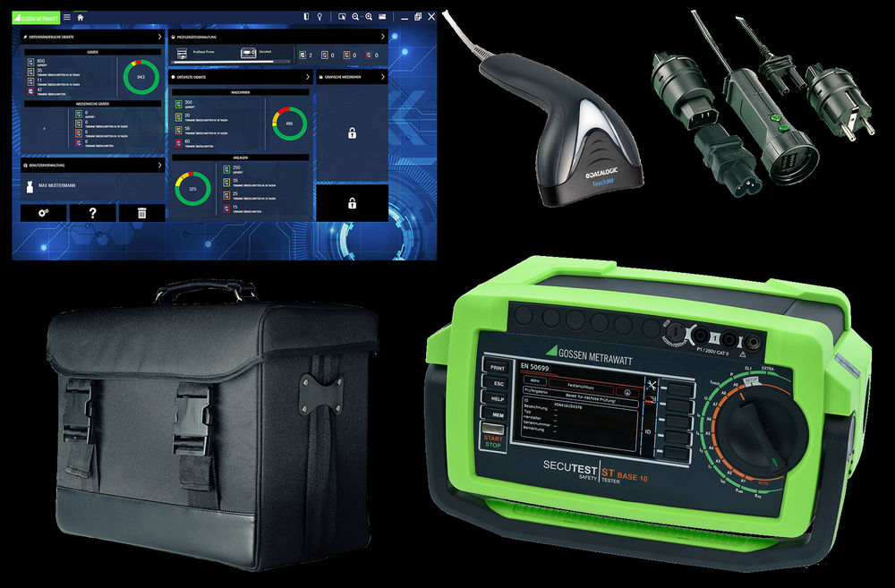Prüfgeräte Set mit SECUTEST ST BASE10 mit DB+ und Datenbank comfort zur Prüfung von elektrischen Geräten, medizinischen Geräten und Schweissgeräten - sowohl mit vordefinierten als auch programmierbaren Prüfsequenzen die entsprechend der neuesten Prüfstandard´s DIN EN 50678 (VDE 0701) DIN EN 50699 (VDE 0702), IEC/EN 62353 (VDE 0751) und IEC/EN 60974-4 (VDE 0544-4) notwendig sind.