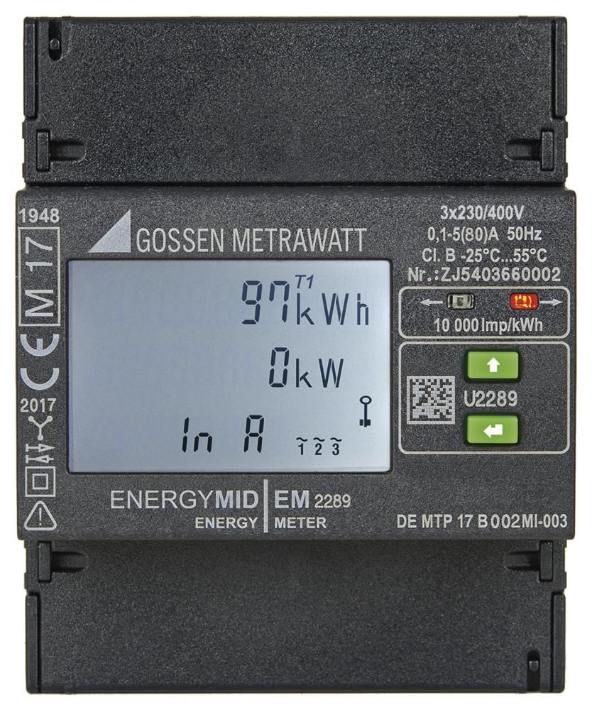 ENERGYMID EM2289 - Multifunktionaler Energiezähler für 4 Leiter-Netze, 400V mit Direktanschluss 5(80) A. Die ENERGYMID EM Energiezähler bieten maximale Funktionalität zum kleinen Preis. Dank einer Vielzahl an Schnittstellen können die Zähler einfach in bestehende Systeme eingebunden werden.. Die neue ENERGYMID Energiezähler-Generation eröffnet Ihnen vollkommen neue Kosteneinsparungspotenziale. Die extrem kleine Bauform mit integrierter Schnittstelle verschafft Ihnen mehr Platz im Verteiler oder Schaltschrank für andere benötigte Funktionen. Dank einer breiten Palette an Schnittstellen sind die geeichten ENERGYMID Energiezähler Ihre perfekte Lösung für die Energieerfassung in Industrie, Haushalt, Gewerbe und Gebäudetechnik - und das zum kleinen Preis.. Multifunktionaler Energiezähler für 4 Leiter-Netz, 400 V mit Direktanschluss 5(80) A ultrakompakte Bauform 4 TE (72 mm) mit integrierter Schnittstelle 4 Quadrantenmessung: Energiebezug und -abgabe Kommunikation via M-Bus, LON, Modbus TCP / BACnet, Modbus RTU, Impulsausgang Erfassung von THD für Strom und Spannung sowie Neutralleiterstrom IN bis zu 8 Tarife . PLATZSPARENDER Integrierte Schnittstelle für die Anbindung an Erfassungs- und Optimierungssysteme Integriertes beleuchtetes Display zum Ablesen von Parametern und Einstellungen Manipulationsschutz mit plombierbarer Abdeckung und Parametriersperre SCHNELLER INSTALLIERT Schnellere Installation durch Fehlererkennung mit Farbwechsel am Display Einfache Fehlererkennung durch Überwachung der Installationsparameter wie beispielsweise Drehfeldrichtung KOSTENEFFEKTIVER Sofort für Abrechnungszwecke geeignet durch Ersteichung nach MID ab Werk Keine zusätzlichen Kosten durch externe Stromwandler In Deutschland nach strengsten Quallitätskriterien gefertigt 3 Jahre GarantieINTEGRIERBAR Vielseitige Anbindung Modbus TCP. Der geeichte Energiezähler kann zur Erfassung und Abrechnung der Wirkenergie in Industrie, Haushalt, Gewerbe und Gebäudetechnik eingesetzt werden. Die Übertragung der Werte an Erfassungs-, Abrechnungs- und Optimierungssysteme sowie Gebäudeautomation und Leittechnik erfolgt über Impulsausgang oder Busschnittstellen. Energieerfassung in der Industrie für einzelne Linien oder Maschinen Messung erneuerbarer Energien aus Photovoltaik- und Windenergieanlagen Erfassung und Verrechnung des Verbrauchs bei Campingplätzen,Einkaufszentren, Wohnanlagen, Bootsanlegern Energieerfassung für Hotels, Kongresszentren und Messen Interne Kostenverteilung für Timesharing-Wohnungen und untervermietete Industriegebäude Verbrauchsabrechnung in Business-Centern Aufbau von Energieerfassungssystemen Fernübertragung von Verbrauchswerten und Kostenabrechnung. 36 Monate Garantie auf Material- und Fabrikationsfehler. ENERGYMID Energiezähler Kurzbedienungsanleitung