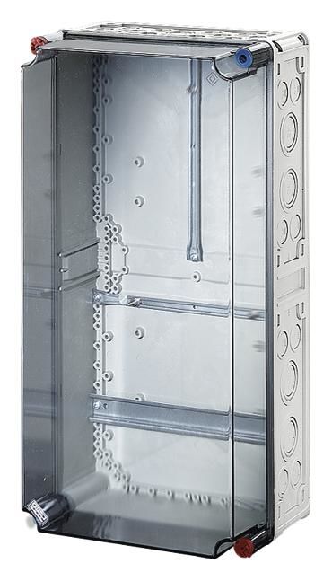 Schutzart IP 65, mit eingebautem Zählerkreuz und Zählerbefestigungsschrauben, aus Thermoplast, grau nach RAL 7032, transparenter Deckel mit Verschlüssen für Werkzeugbetätigung, zweifach plombierbar.