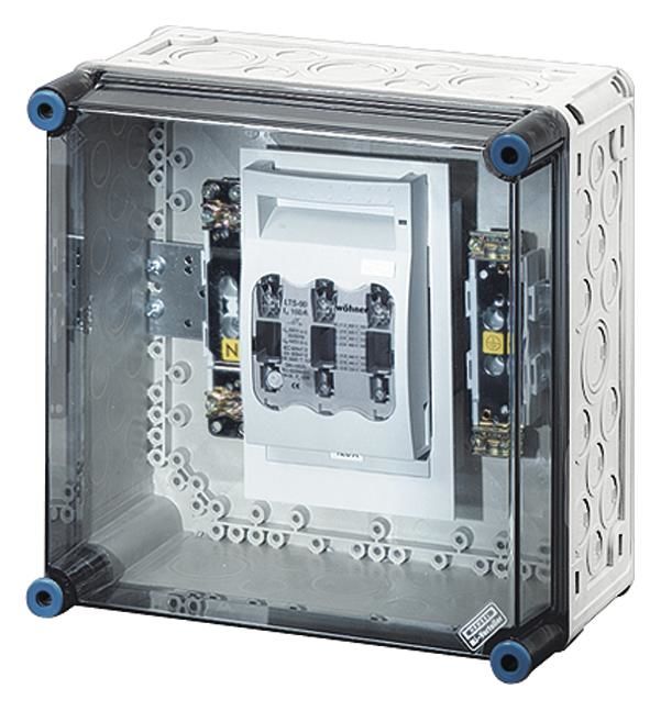 Schutzart IP 65, aus Thermoplast, grau nach RAL 7032, transparente Deckel mit Verschlüssen für Werkzeugbetätigung, Sicherungslasttrenner Größe NH 00, NH 1 bzw. NH 2, mit Blendrahmen, 690 V AC, 3-polig + PE+N, plombierbar