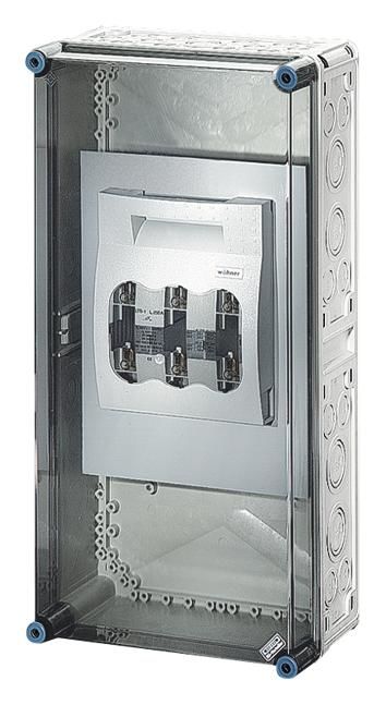 Schutzart IP 65, aus Thermoplast, grau nach RAL 7032, transparente Deckel mit Verschlüssen für Werkzeugbetätigung, Sicherungslasttrenner Größe NH 00, NH 1 bzw. NH 2, mit Blendrahmen, 690 V AC, 3-polig + PE+N, plombierbar