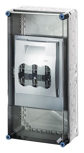 Schutzart IP 65, aus Thermoplast, grau nach RAL 7032, transparente Deckel mit Verschlüssen für Werkzeugbetätigung, Sicherungslasttrenner Größe NH 00, NH 1 bzw. NH 2, mit Blendrahmen, 690 V AC, 3-polig + PE+N, plombierbar