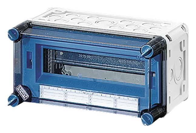 Schutzart IP 54 mit Einsteckstutzen, IP 54 mit Anbaustutzen zum Einbau von Geräten mit Schnappbefestigung, aus Thermoplast, grau nach RAL 7032, Deckel mit Verschlüssen für Handbetätigung, mit Abdeckstreifen für den Geräteausschnitt, PE- und N-Klemmen.