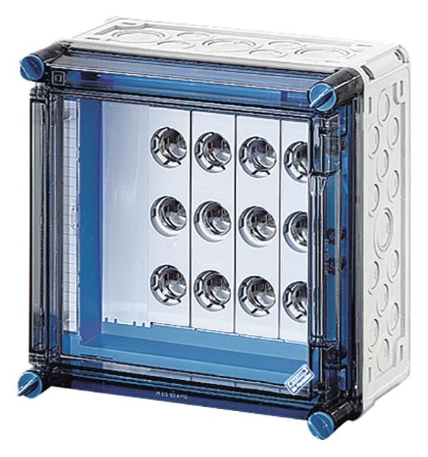 Schutzart IP 65, aus Thermoplast, grau nach RAL 7032, transparente Deckel mit Verschlüsse für Handbetätigung, 5-polig Sammelschienensystem 250 A, mit Berührungschutz, PE- und N-Klemmen, Paßringsytem.