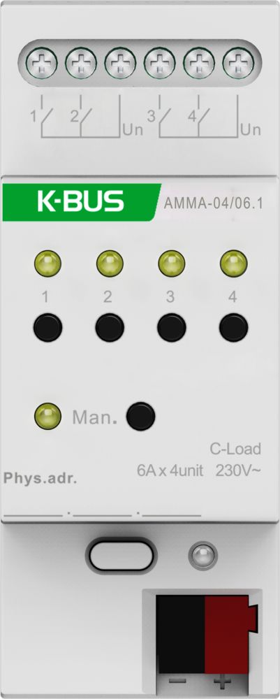 Das Gerät verfügt über bis zu 24 Schalt-Ausgänge / 12 Jalousie-Ausgänge AC / 6 Jalousie-Ausgänge DC (Polumschaltung) / 6 Lüfter-Ausgänge oder 6 Ventil- Ausgänge. Die Ausgänge werden über die Parameter konfiguriert und sind individuell einstellbar.