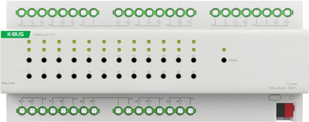 Das Gerät verfügt über bis zu 24 Schalt-Ausgänge / 12 Jalousie-Ausgänge AC / 6 Jalousie-Ausgänge DC (Polumschaltung) / 6 Lüfter-Ausgänge oder 6 Ventil- Ausgänge. Die Ausgänge werden über die Parameter konfiguriert und sind individuell einstellbar.