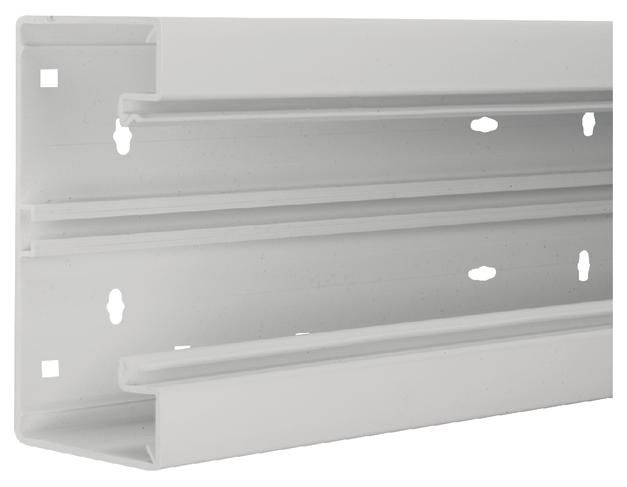 Brüstungskanal-Unterteil PVC frontrastend BR 68x130mm OT 80mm in lichtgrau.Kanalunterteil zum Elektro-Installationskanal-System Brüstungskanal aus Kunststoff nach DIN EN 50085-1 als Geräteeinbaukanal mit Oberteilbreite 80 oder 120 mm zum Einbau handelsüblicher Geräte ohne oder mit Zusatzblenden. Mit Bodenlochung (allseitiger Bohrtolleranzausgleich) zur direkten Wandmontage und zusätzlicher Rechtecklochung zur werkzeuglosen Befestigung des Kanals mittels Clip-Technik auf Konsolen. Bei Oberteilbreite 80 mm mit frontrastendem, werkzeuglosem Geräteeinbau zur Befestigung von Geräten und Geräteeinbaudosen mit Schnellbefestigung - zusätzliches C-Profil als Geräteeinbaumöglichkeit wie bei allen Kanälen mit Oberteilbreite 120 mm. Kupplungen zur einfachen und passgenauen Kanalmontage, Trennwände und Leitungsrückhalteklammern als Zubehör erhältlich.