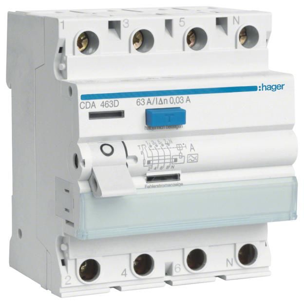 Der Artikel Hager CDA463D Fi-Schalter 4-pol 6kA 63A 30mA Typ A ist derzeit auf Lager