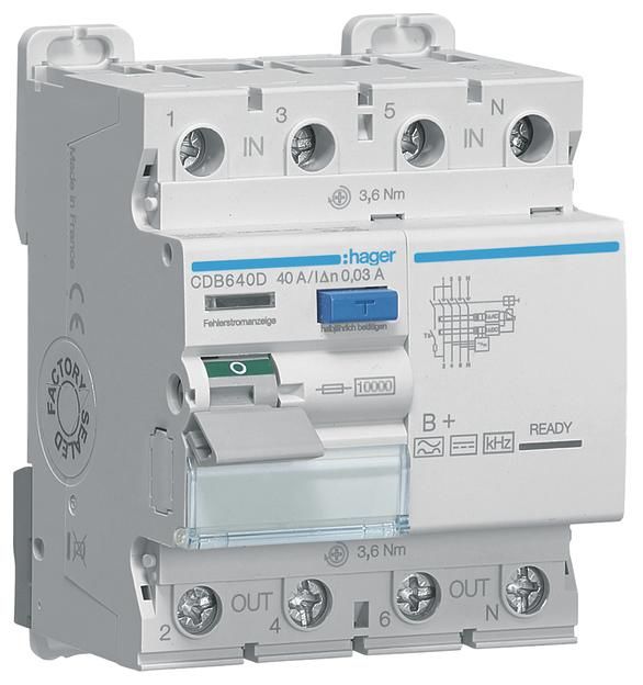 Der Artikel Hager CDB640D Fehlerstromschutzschalter 4 polig 10kA 40A 30mA Typ B+ ist derzeit auf Lager