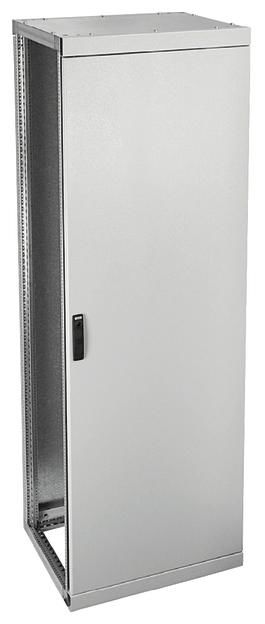 Schrankgerüst aus verzinktem Stahlblech, Deckblech und Rückwand aus feuerverzinktem Stahlblech. Mit waagrechter Abfangschiene zur Tragschienen-Stabilisierung, Koppelplatten zur Tragschienenbefestigung, vorbereitet für univers N Innenausbausystem. Sammelschienendurchführung durch offene Seitenwände nebeneinander anflanschbar.