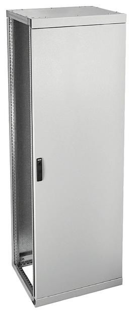 Schrankgerüst aus verzinktem Stahlblech, Deckblech und Rückwand aus feuerverzinktem Stahlblech. Mit waagrechter Abfangschiene zur Tragschienen-Stabilisierung, Koppelplatten zur Tragschienenbefestigung, vorbereitet für univers N Innenausbausystem. Sammelschienendurchführung durch offene Seitenwände nebeneinander anflanschbar.