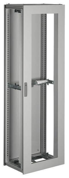 Schrankgerüst aus verzinktem Stahlblech, Deckblech und Rückwand aus feuerverzinktem Stahlblech. Mit waagrechter Abfangschiene zur Tragschienen-Stabilisierung, Koppelplatten zur Tragschienenbefestigung, vorbereitet für univers N Innenausbausystem. Sammelschienendurchführung durch offene Seitenwände nebeneinander anflanschbar.