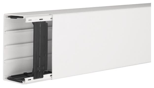 Kanalunterteil/-oberteil mit Trennwand-Einbaumöglichkeit, einrastbar, mit vorgestanzter Bodenlochung im Abstand von 125 mm, ab Größe 40 x 60 mm mit vormontierten Kupplungen zur einfachen Ausrichtung bei Ein-Mann-Montage und mit vormontierten anstellbaren Rückhalteklammern.