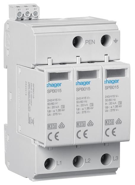 Der Artikel Hager SPB315 Überspannungsableiter T2 3P 40kA TNC Defektanzeige +Kontakt ist derzeit auf Lager