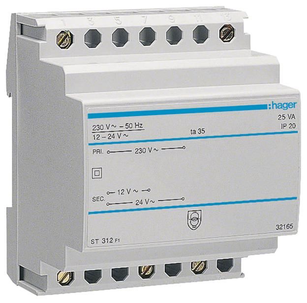 Hager ST312 Sicherheitstrafo 230V/12+24V 25VA 4PLE
