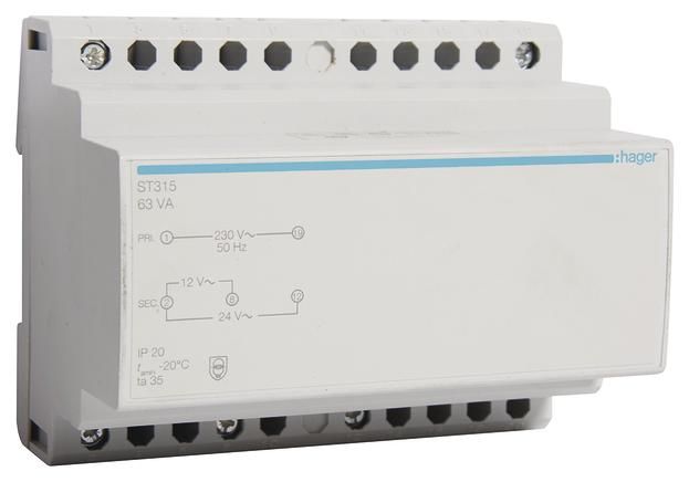 Hager ST315 Sicherheitstrafo 230V/12+24V 63VA 6PLE