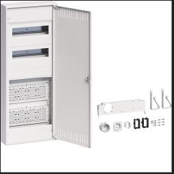 2-reihiger Geräteträger aus verzinktem Stahlblech. 2-reihige Geräteabdeckung aus Kunststoff für 24 (28) Module mit 46 mm Geräteschlitz. Fingersichere PE/N-Klemme mit Stecktechnik in montagefreundlicher Schnapptechnik. Zur sicheren Trennung zwischen Multimediateil und Stromkreisverteilung ist eine Abschottung montiert, die gleichzeitig auch die Aufnahme für bis zu zwei Steckdosen ermöglicht. Großzügiger Montageraum mit vormontierter/n Montageplatte/n aus Kunststoff regelmäßiger Lochung nach DIN 24041. Gerätehalter für die schraublose Befestigung von Geräten zur direkten Montage auf dem Lochblech durch Einhängen oder Verschrauben liegen bei.