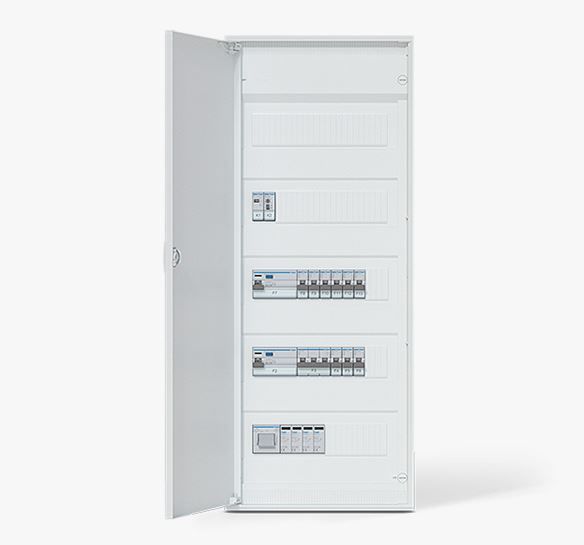 Bemessungsspannung 400V/50Hz. Schutzart,IP30, Schutzklasse II schutzisoliert. Bestehend aus Kunststoffbodenplatte mit serienmäßigem Leitungsabfang, Geräteträger aus verzinktem Stahlblech und DIN Hutschiene zum Einbau von Modulargeräten nach DIN 43880. Geräteabdeckung aus Kunststoff mit 46 mm Geräteschlitz, serienmäßig plombierbar. Fingersichere PE/N-Klemme mit Stecktechnik in montagefreundlicher Schnapptechnik und N-Klemme für FI-Kreise.