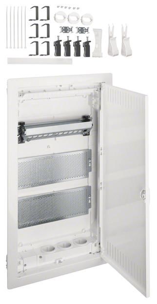 Bestehend aus: Kunststoff-Mauerkasten mit serienmäßigem Leitungsabfang, ausbrechbaren Leitungseinführungsschieber mit Schnappbefestigung und integrierter Wasserwaage. Hohlwandbefestigung mit Schnellfixierungshebel, seitlich oder oben/unten montierbar. Verdrehbarer Blendrahmen mit Lüftungstür aus Stahlblech, pulverbeschichtet und eingebrannt, mit 15 mm Putzausgleich. Lüftungstür, frontbündig mit innenliegenden handbedienbaren Scharnieren. Türverschluss mit frontbündiger Griffmulde und selbsttätig zurückklappendem Griff, Türanschlag rechts oder links ohne Blendrahmen-Demontage.