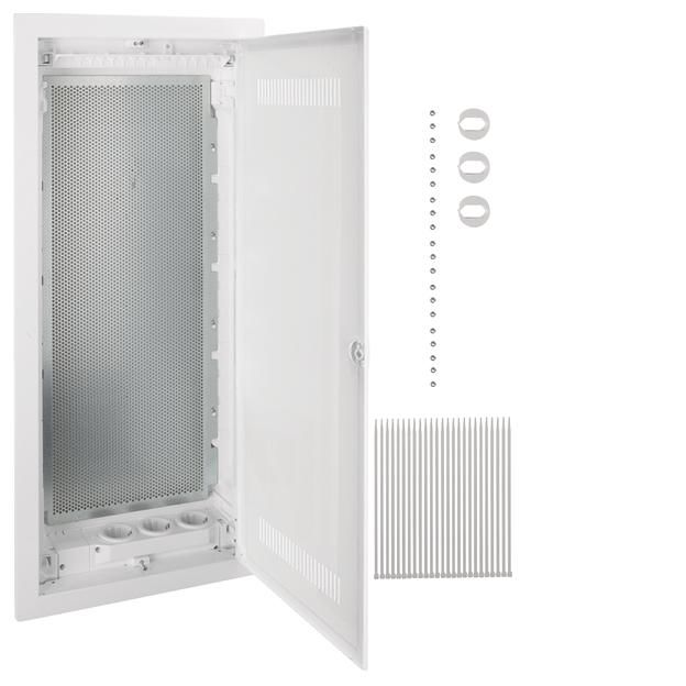 Bestehend aus Kunststoff-Mauerkasten mit serienmäßigem Leitungsabfang und ausbrechbaren Leitungseinführungsschieber mit Schnappbefestigung sowie integrierter Wasserwaage, inkl. verzinkten Stahlblech-Befestigungslaschen. Verdrehbarer Blendrahmen mit Lüftungstür aus Stahlblech mit geschlitztem Kunststoffeinsatz für ein besseres WLAN-Signal, pulverbeschichtet und eingebrannt, mit 15 mm Putzausgleich. Lüftungstür, frontbündig mit innenliegenden handbedienbaren Scharnieren. Türverschluss mit frontbündiger Griffmulde und selbsttätig zurückklappendem Griff. Türanschlag rechts oder links ohne Blendrahmen-Demontage.
