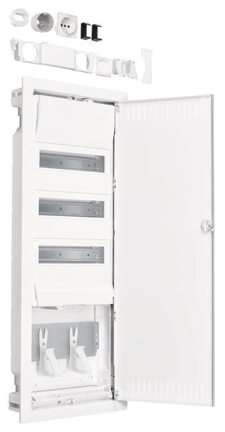 3-reihiger Geräteträger aus verzinktem Stahlblech. 3-reihige Geräteabdeckung aus Kunststoff für 36 (42) Module mit 46 mm Geräteschlitz, Schnellverschlussbefestigung mit 90°-Drehung an dem Leitungseinführungsschieber und an der Abschottung, an beiden Seiten serienmäßig plombierbar. Fingersichere PE/N-Klemme mit Stecktechnik in montagefreundlicher Schnapptechnik. Zur sicheren Trennung zwischen Multimediateil und Stromkreisverteilung ist eine Abschottung montiert, die gleichzeitig auch die Aufnahme für bis zu zwei Steckdosen ermöglicht. Großzügiger Montageraum mit vormontierter/n Montageplatte/n aus verzinktem Stahlblech mit 3,2 mm regelmäßiger Lochung nach DIN 24041. Gerätehalter für die schraublose Befestigung von Geräten zur direkten Montage auf dem Lochblech durch einhängen oder verschrauben liegen bei.