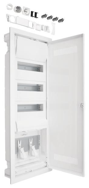 3-reihiger Geräteträger aus verzinktem Stahlblech. 3-reihige Geräteabdeckung aus Kunststoff für 36 (42) Module mit 46 mm Geräteschlitz, Schnellverschlussbefestigung mit 90°-Drehung an dem Leitungseinführungsschieber und an der Abschottung, an beiden Seiten serienmäßig plombierbar. Fingersichere PE/N-Klemme mit Stecktechnik in montagefreundlicher Schnapptechnik. Zur sicheren Trennung zwischen Multimediateil und Stromkreisverteilung ist eine Abschottung montiert, die gleichzeitig auch die Aufnahme für bis zu zwei Steckdosen ermöglicht. Großzügiger Montageraum mit vormontierter/n Montageplatte/n aus verzinktem Stahlblech mit 3,2mm regelmäßiger Lochung nach DIN 24041. Gerätehalter für die schraublose Befestigung von Geräten zur direkten Montage auf dem Lochblech durch einhängen oder verschrauben liegen bei.