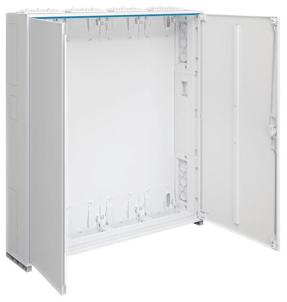 Tür frontbündig mit innenliegenden, justierbaren Scharnieren, wahlweise rechts oder links anschlagbar mit 110° Öffnungswinkel. Türverschluss mit Vorreiber, ab Breite 800 mm und bei allen Schränken ab einer Höhe von 1250 mm mit Stangenverschluss mit Dreipunktschließung. Türverschluss durch andere Schließungen austauschbar. Schrank nebeneinander und übereinander anflanschbar. Schrankgröße 1- bis 5-feldrig mit 72 bis 540 Platzeinheiten (PLE).