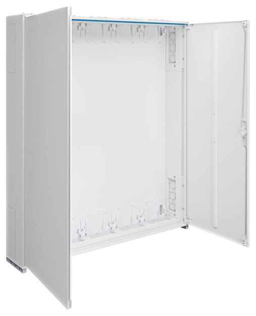 Tür frontbündig mit innenliegenden, justierbaren Scharnieren, wahlweise rechts oder links anschlagbar mit 110° Öffnungswinkel. Türverschluss mit Vorreiber, ab Breite 800 mm und bei allen Schränken ab einer Höhe von 1250 mm mit Stangenverschluss mit Dreipunktschließung. Türverschluss durch andere Schließungen austauschbar. Schrank nebeneinander und übereinander anflanschbar. Schrankgröße 1- bis 5-feldrig mit 72 bis 540 Platzeinheiten (PLE).