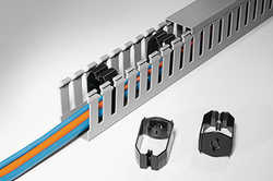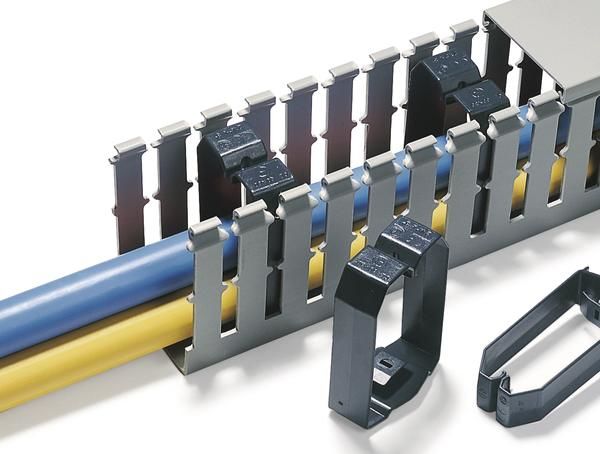 Die HTWD-BWR Drahthalteklammern werden an den Montagepunkten der HTWD-PN und HTWD-PW Verdrahtungskanälen verankert. Ihr Einsatz ist besonders bei vertikaler oder über Kopf Verdrahtung zu empfehlenl, da die Leitungen vor dem Herausfallen gesichert sind.