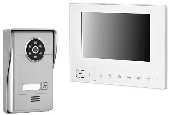 Funk-Video-Türsprechanlage, bestehend aus Türsprechstelle mit Namensschild und Schutzhaube sowie Innenstation mit 17,8 cm ( 7 Zoll ) LCD-Flachbildschirm (sichtbare Bilddiagonale 17,6cm), jeweils mit Freisprecheinrichtung. Die Türsprechstelle