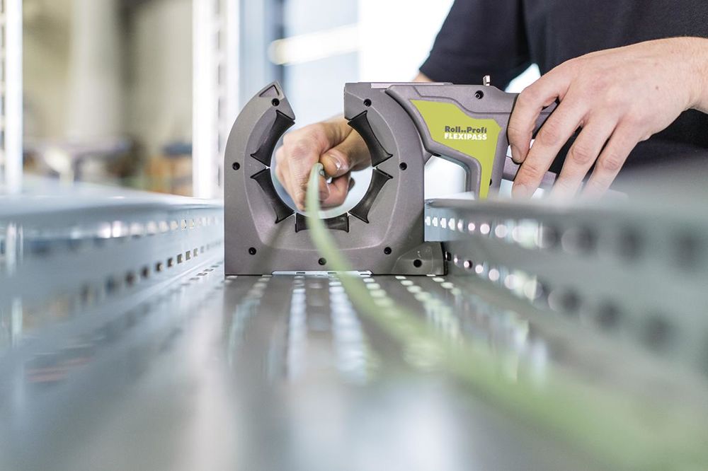 Mit seinem ergonomischen und kompakten Design und leicht-laufenden Führungsrollen, sorgt der FLEXIPASS an allen Ecken und Kanten von Kabelkanälen für einen sicheren und präzisen Kabeltransfer. Einsetzbar ist der FLEXIPASS für Leitungen bis zu einem Durchmesser von 38 mm. Besonderes Augenmerk liegt hierbei auf dem Handling von empfindlichen Daten- und Spezialleitungen. Die clevere Anordnung der Laufrollen sorgt für optimale und widerstandsfreie Durchführung und Transport der Kabel. So sparen Sie wertvolle Zeit beim Auf- und Abbau des Kabelführungssystems.