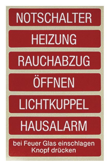 Mit Beschriftung 'Rauchabzug öffnen, Hausalarm, Heizung Notschalter, Notschalter, Bei Feuer Scheibe einschlagen ? Taste drücken'.