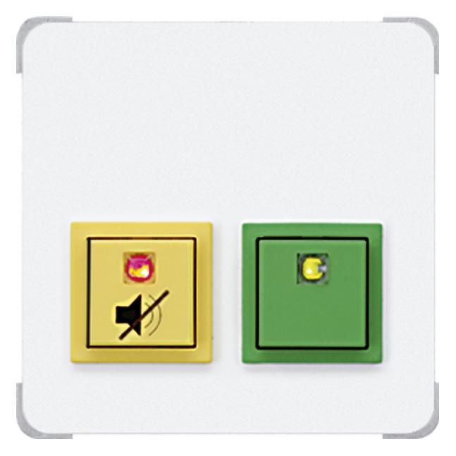 Die Dienstzimmereinheit kann zusätzlich zu den Komponenten des Notrufsets installiert werden, z.B. in einem Personal- oder Empfangsraum. Eine grüne Taste markiert die Anwesenheit, eine gelbe Taste unterdrückt das akustische Notrufsignal des Rufmoduls für 20 Sekunden.