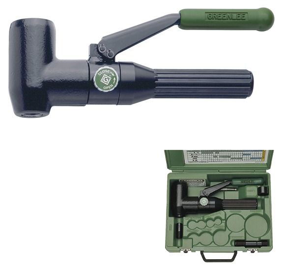 Entwickelt 71 kN hydraulische Kraft. Einsetzbar von 15,2 bis 64,0 mm sowie für quadratische, rechteckige und Speziallocher bis 68 x 68 mm - in bis zu 3 mm Stahlblech Lieferung: Kunststoffkoffer mit Vorprägungen für Ergänzungs-Sätze