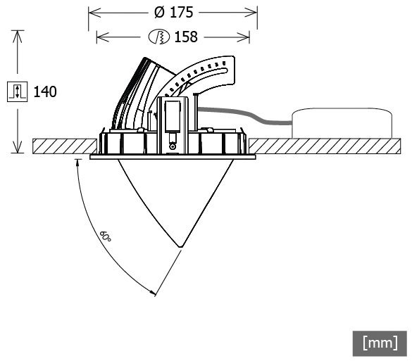 Einbaustrahler mit konischem Lichtkopf, auch für Beleuchtung von Vertikalflächen geeignet (schattenfreie Wandbeleuchtung bis an die Deckenkante), Lichtkopf 355° drehbar und 60° herausschwenkbar, hohe Wartungsfreundlichkeit, keine UV- und Wärmestrahlung, Wärmemanagement mit Passivkühlung (Kühlkörper aus Aluminiumdruckguss), High-Performance Spiegelreflektor aus Aluminium mit präziser symmetrischer Abstrahlcharakteristik für maximale Lichtausbeute und optimale Entblendung, Front-/Einbauring und Lichtkopf aus Zinkdruckguss, reflektionsfreies EnergyVision Schutzglas klar, werkzeugloser Deckeneinbau mit Schnellspannfedern (Fangseil, automatische Anpassung der Deckenstärke), Leuchte und Betriebsgerät über Kabel (Länge: 500 mm) fest verbunden, Betriebsgerät fertig für Netzanschluss, Betriebsgerät (LED-Konverter) inklusive (Platzierung extern)