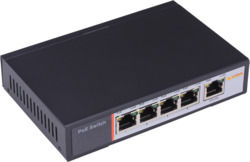 - Vier 10/100 Mbps PoE Anschlüsse und ein 10/100 MBps Kein-PoE Anschluss