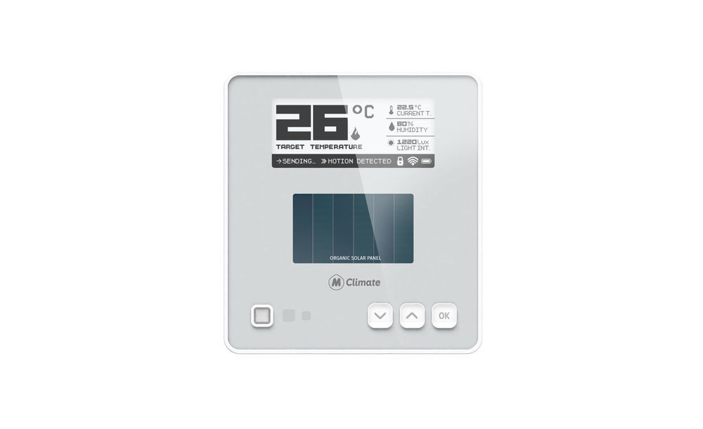 MClimate CO2 Display LoRaWAN is a stand-alone CO2 sensor powered entirely by solar energy using an organic solar panel. The device features a 7,4 cm ( 2,9 Zoll ) e-ink screen, sensor for movement (PIR), temperature and humidity sensor, LUX sensor and NDIR CO2 sensor. The user can see the current levels of CO2 as well as historical trend. The device sends an uplink when it detects movement as well as periodically. The data from the CO2 Display can be used in any LoRaWAN-compatible system, incl. Building Management Systems to control demand-based ventilation. Sensor information can be exposed as datapoints in Modbus, BACnet and KNX systems through the use of a special gateway.
