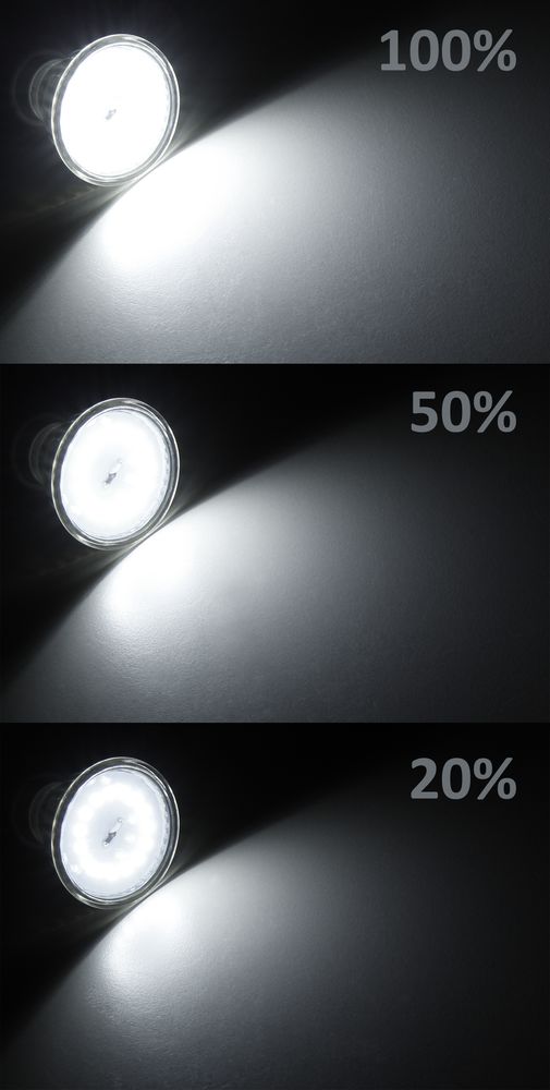 - dimmbar per Lichtschalter: Startet mit 100% -> 50% -> 20%