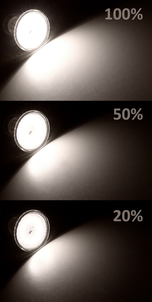 - dimmbar per Lichtschalter: Startet mit 100% -> 50% -> 20%