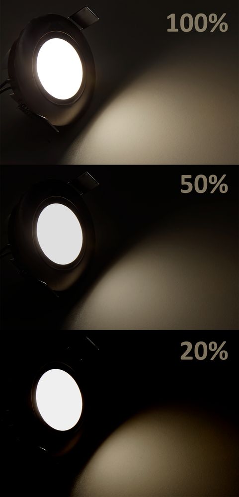 - step-dimmbar am Lichtschalter über Ein/Aus: 100% -> 50% -> 20% -> 0%