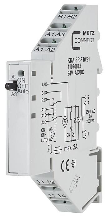 Der Artikel Metz Connect 11070813 BTR KRA-SR-F10/21 24VAC/DC 1We 8A Koppelbaustein ist derzeit auf Lager