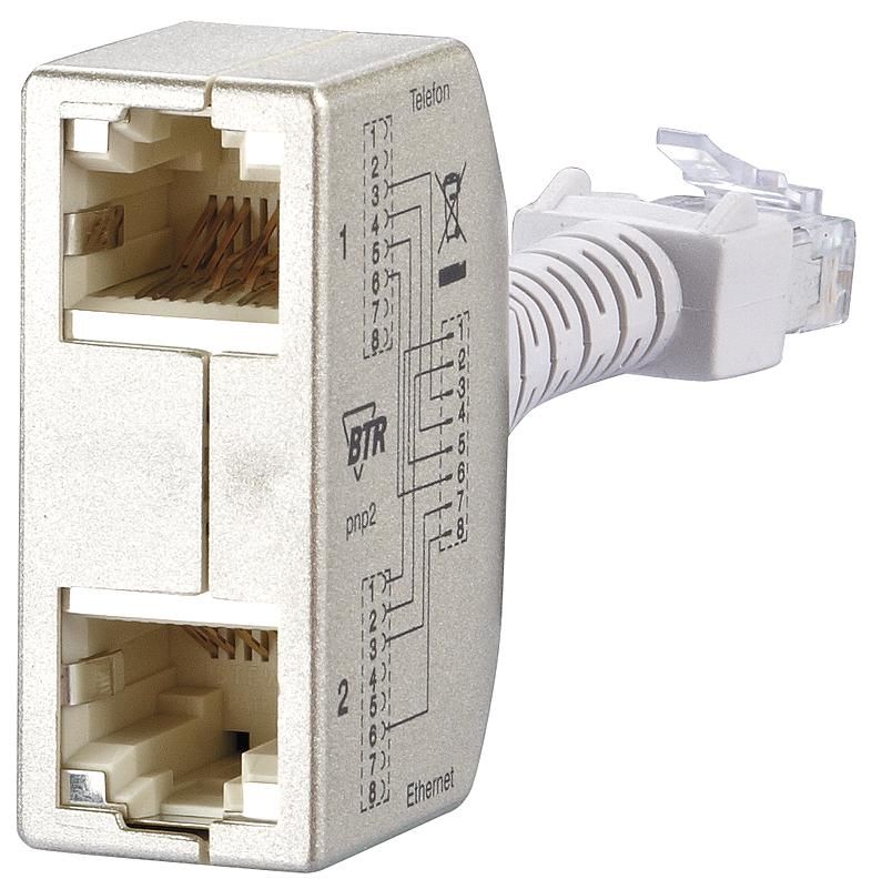 • Cable sharing Adapter zum gleichzeitigen Betrieb von zwei 4-adrigen Diensten, hier: 1 x Ethernet und 1 x Telefon (ISDN), über eine 8-adrige Installationsleitung
