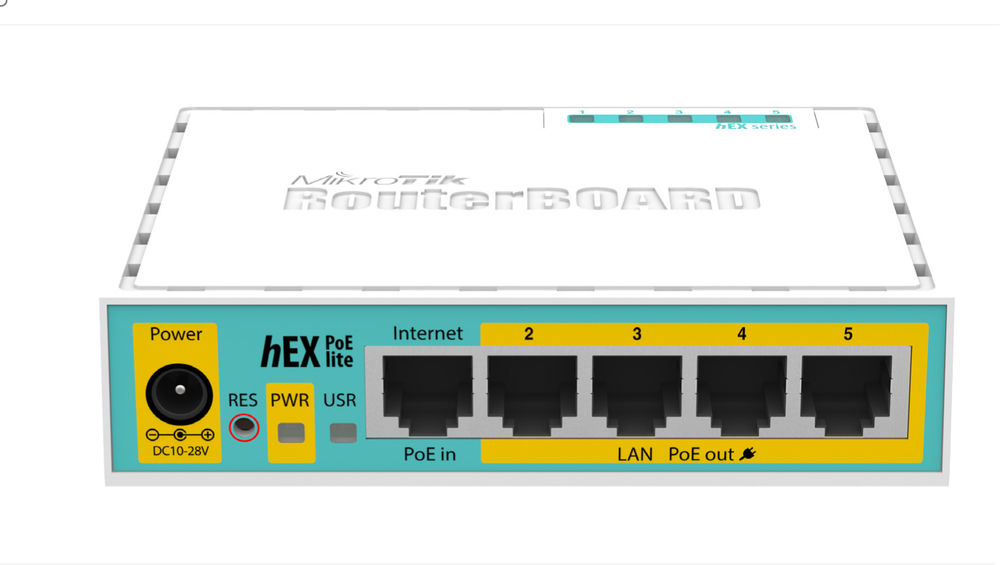 Hex-PoE mit 800-MHz-CPU, 128 MB RAM, 5x Gigabit-LAN (vier mit PoE-Ausgang), USB, RouterOS L4, Kunststoffgehäuse und Netzteil