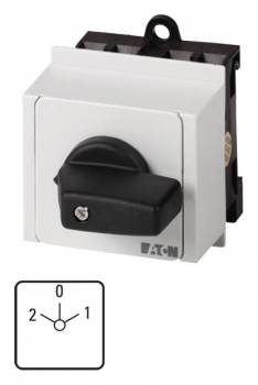 Umschalter, Sortiment: Steuerschalter, Typkenner: T0, mit schwarzem Knebel und Frontschild, Kontakte: 2, Schutzart: Front IP30, Bauform: Verteilereinbau, Schaltwinkel: 45 °, Schaltverhalten: rastend, mit 0-Stellung, Frontschild: 2-0-1, Bemessungsbetriebsleistung AC-23A, 50 - 60 Hz 400 V: P = 5.5 kW, Bemessungsdauerstrom: Iu = 20 A, 1 Baueinheit(en), Normen und Bestimmungen: IEC/EN 60947, VDE 0660, IEC/EN 60204, CSA, UL, Lasttrennschalter nach IEC/EN 60947-3