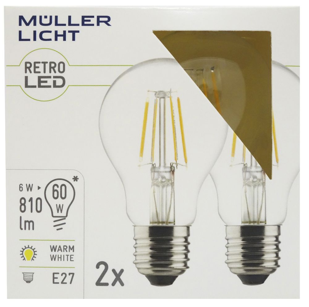 Der Artikel Muellerlicht ETT-1451880 LED Filament Glühlampe, E27, 6W, 810lm, 2700K, warmweiß, 2er Set ist derzeit auf Lager