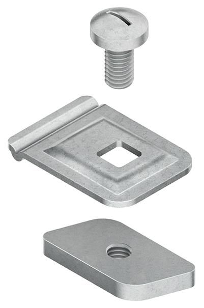 Trennstegbefestigungsklemme, zur Befestigung von Trennstegen in der trapezförmigen Quersicke der Weitspannkabelrinnen und auf Weitspannkabelleitern mit Sprossen von 16 mm Schlitzweite, tauchfeuerverzinkt nach DIN EN ISO 1461, einschließlich Gleitmutter GSM 406 und Schraube M 6x10 DIN EN ISO 1580 aus Edelstahl-Rostfrei, Werkstoff-Nr. 1.4301.