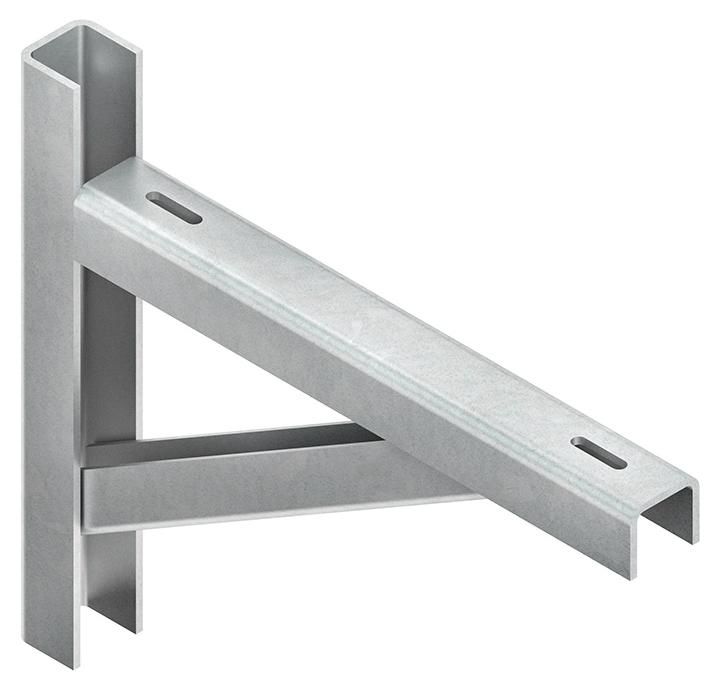 Wandausleger, schwer, für die Verlegung von Kabelrinnen und Kabelleitern ohne zusätzliche Gewindestangenabhängung, tauchfeuerverzinkt nach DIN EN ISO 1461, einschließlich galvanisch verzinkten anteilmäßigem Befestigungszubehör. Zur Verwendung im Funktionserhalt bitte Zusatzvorschriften beachten!