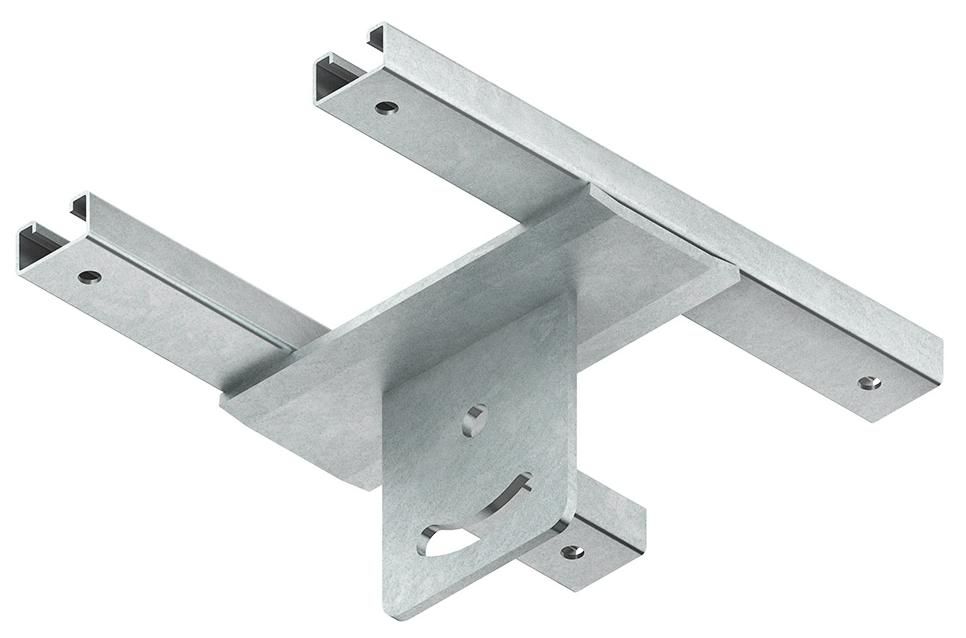 Kopfplatte, mit einer vertikalen Ausrichtung von +- 30ø, zum Anklemmen an in Längsrichtung geneigt verlaufenden Trägern von Stahlkonstruktionen, zur Herstellung von Hängestiel Systeme HUF 50/... und HDUF 50/..., deren Kabeltrassenverlauf kreuzend zum Träger verläuft, einschließlich tauchfeuerverzinkten anteilmäßigem Befestigungszubehör, wobei HSK... und HK 510/...F gesondert bestellt werden müssen, tauchfeuerverzinkt nach DIN EN ISO 1461.