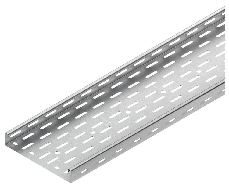 Kabelrinne nach DIN EN 61537, mit versetzt angeordneter Boden- und Seitenperforation, bandverzinkt nach DIN EN 10346, einschließlich einstückigem U-förmigen Stoßstellenverbinder RV 35... und anteilmäßigem Befestigungszubehör.