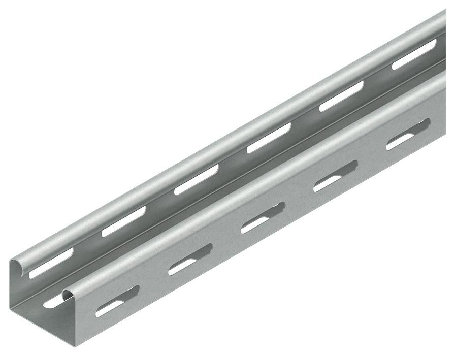 Minikabelrinne nach DIN EN 61537, mit Boden- und Seitenperforation, bandverzinkt nach DIN EN 10346, einschließlich einstückigem U-förmigen Stoßstellenverbinder RV 50... und anteilmäßigem Befestigungszubehör.